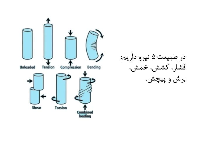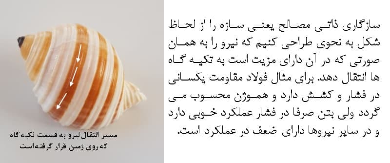 طبیعت هم در طراحی هایش دقیقا همین کار را انجام می دهد. هر ماده ای در طبیعت در برابر یک یا تعدادی از نیروها ی بالا مقاوم تر است پس شکل هایش را به گونه ای طراحی می کند تا نیرو ها را به همان صورتی که مقاوم تر است انتقال دهد. مثل صدف ها. جنس صدف ها از آهک می باشد و آهک از بین پنج نیروی بالا در فشار مقاوم تر است. پس صدف ها به دست توانمند طبیعت به گونه ای ساخته می شوند که نیرو ها را غالبا به صورت فشاری انتقال دهند.